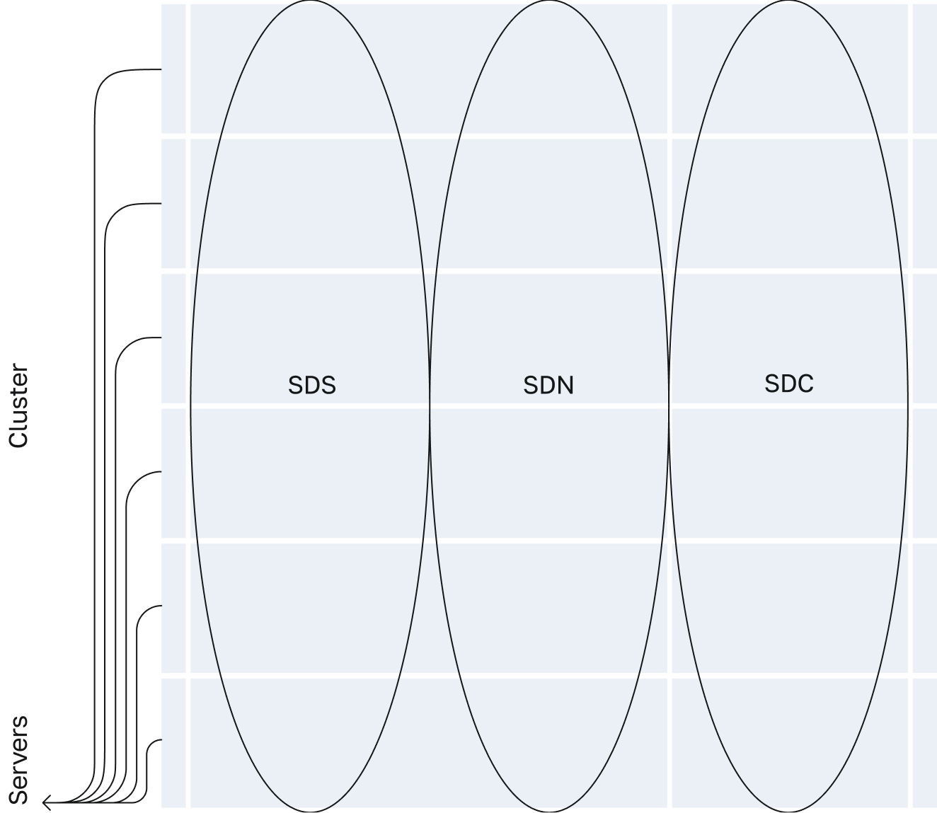 Geleneksel olarak birbirinden farklı üç bileşen, yazılım tanımlı tek bir çözümde birleştirilir. Platform, aynı anda 3 işlevi yerine getiren sunuculara dayalı tek bir küme alanı oluşturur: